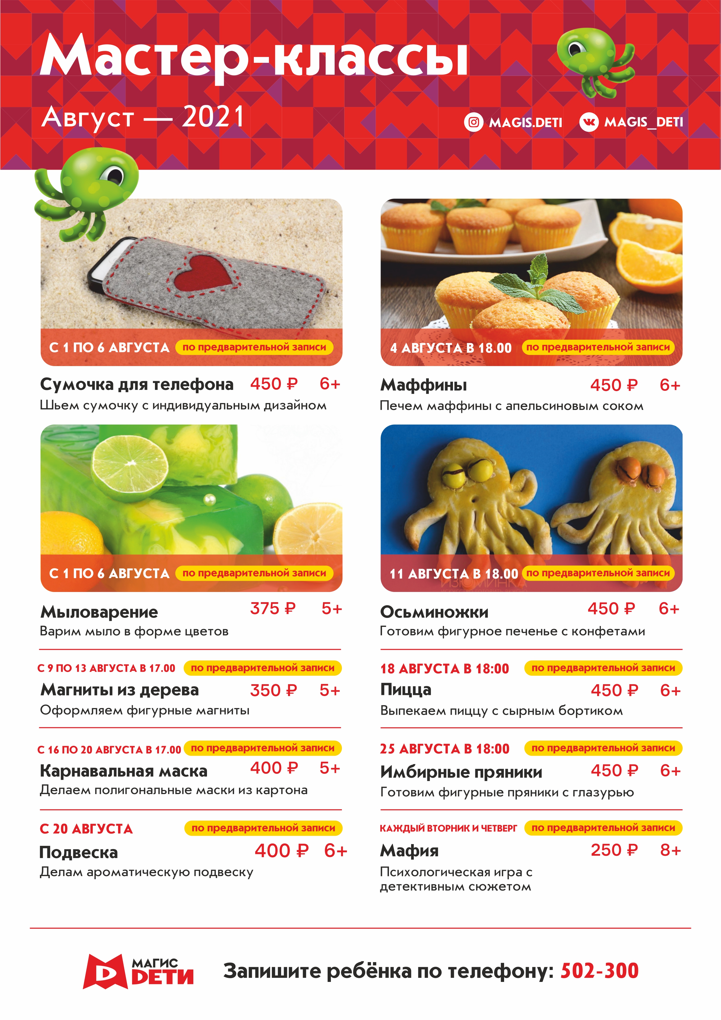 Скоро лето подойдет к концу, и это самый настоящий повод провести этот месяц максимально увлекательно и продуктивно. Вас ждет увлекательная программа мастер-классов на предстоящий август: мы будем мастерить из дерева, шить брелоки, делать пеналы, а также создавать свои кулинарные шедевры!
