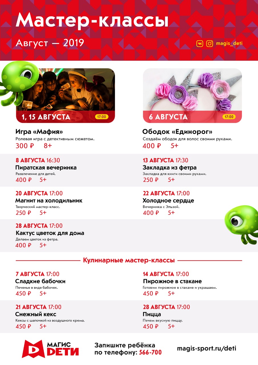 Знакомьтесь с афишей мастер-классов на август, звоните и записывайтесь!