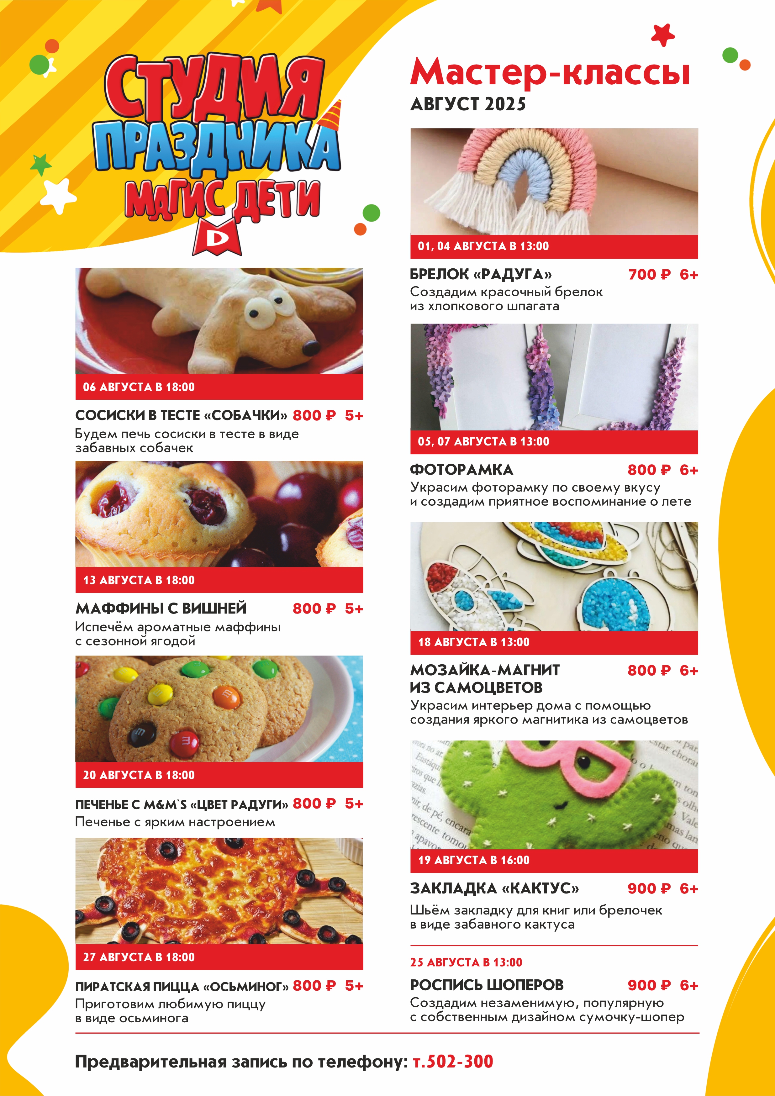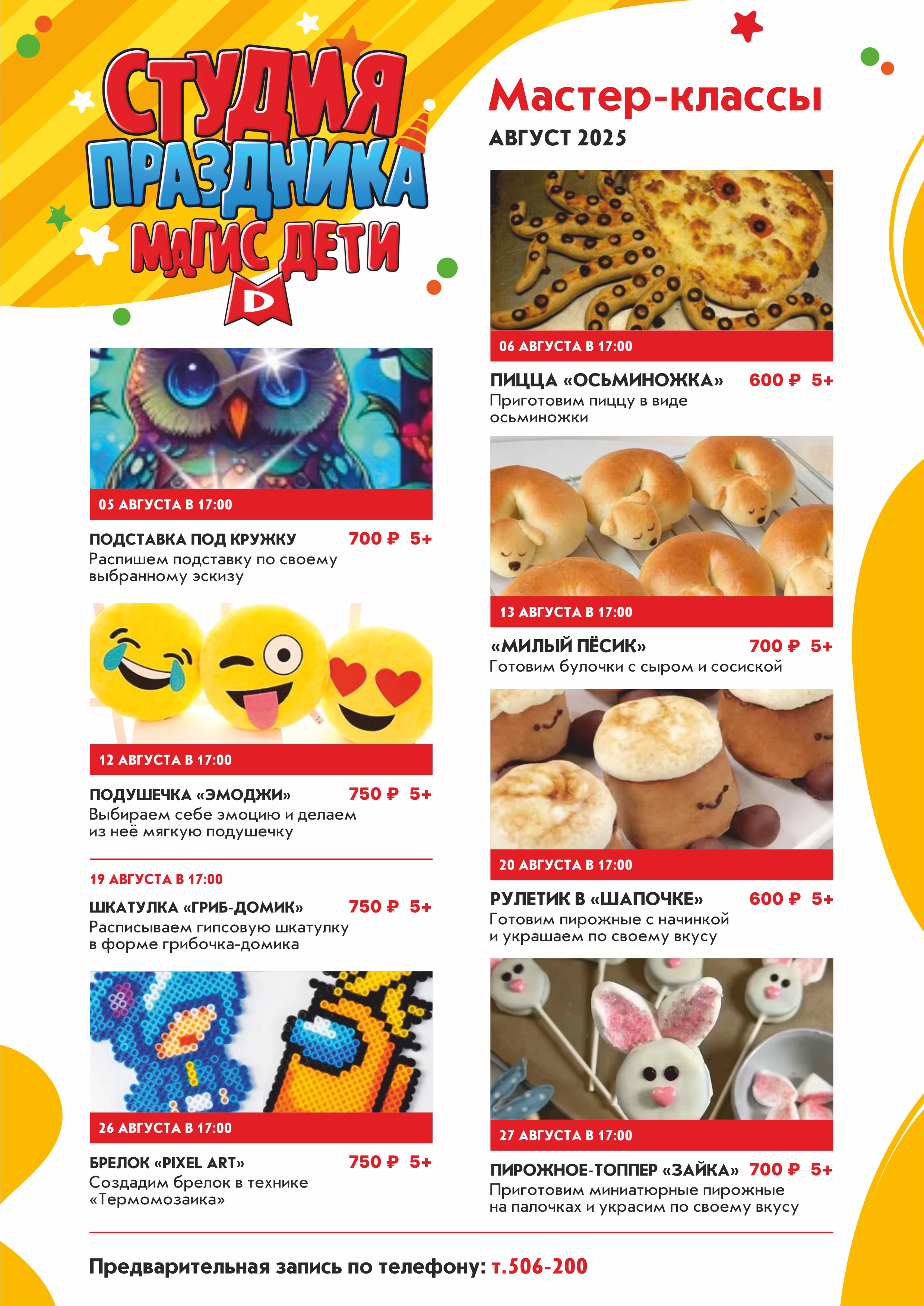 6 августа в 17:00 испечём ароматную пиццу "Осьминожку" 13 августа в 17:00 приготовим булочки с сыром и сосиской в виде милых пёсиков 20 августа в 17:00 изготовим пирожные с начинкой и украсим по своему вкусу 27 августа в 17:00 приготовим миниатюрные пирожные на палочке "Зайка" с собственным дизайном