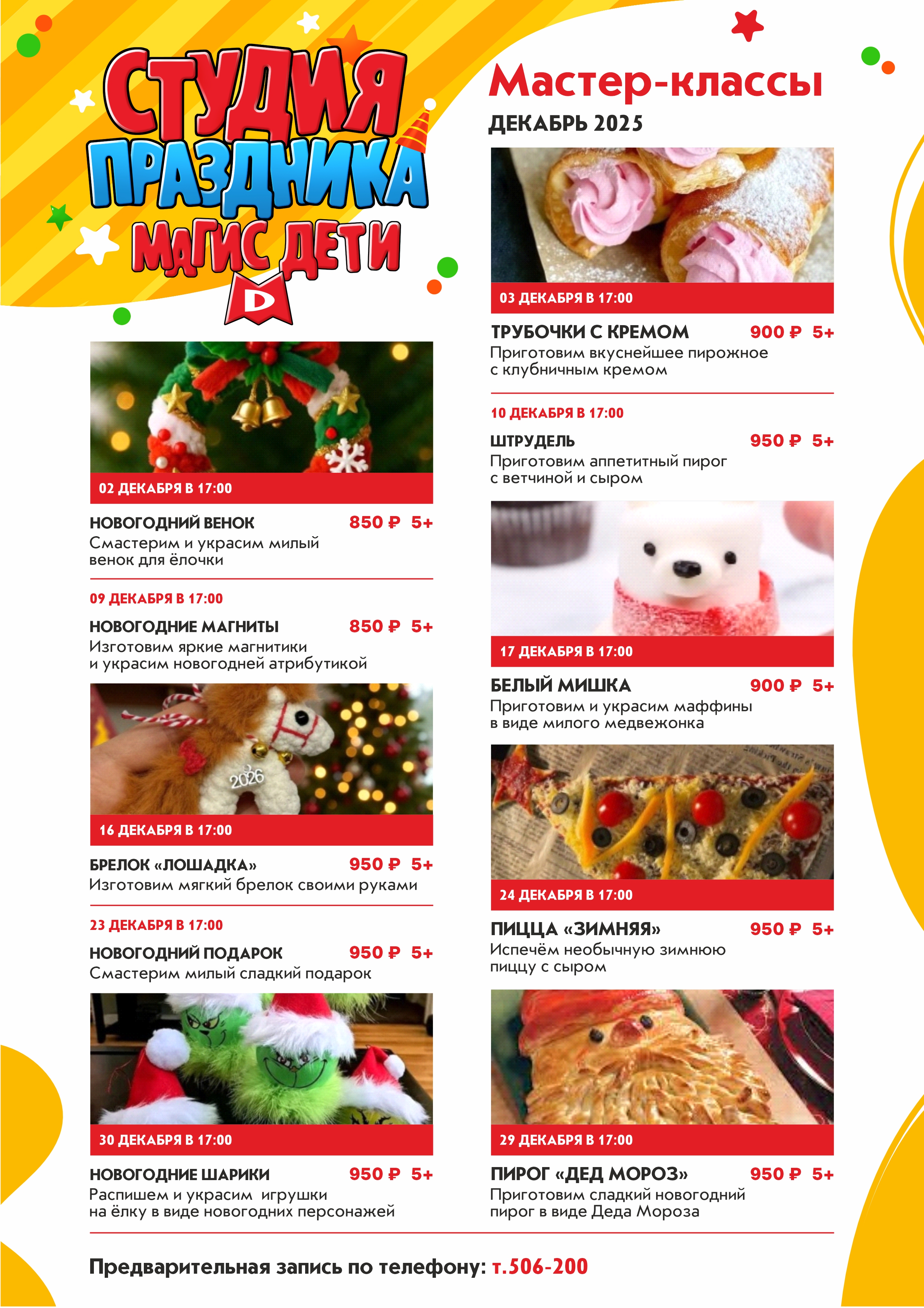 2 декабря в 17:00 смастерим и украсим милый венок для ёлочки 9 декабря в 17:00 изготовим яркие магнитики и украсим их новогодней атрибутикой 16 декабря в 17:00 изготовим мягкий брелок в виде символа наступающего года 23 декабря в 17:00 смастерим милый сладкий подарок 30 декабря в 17:00 распишем и украсим игрушки на ёлку в виде новогодних персонажей