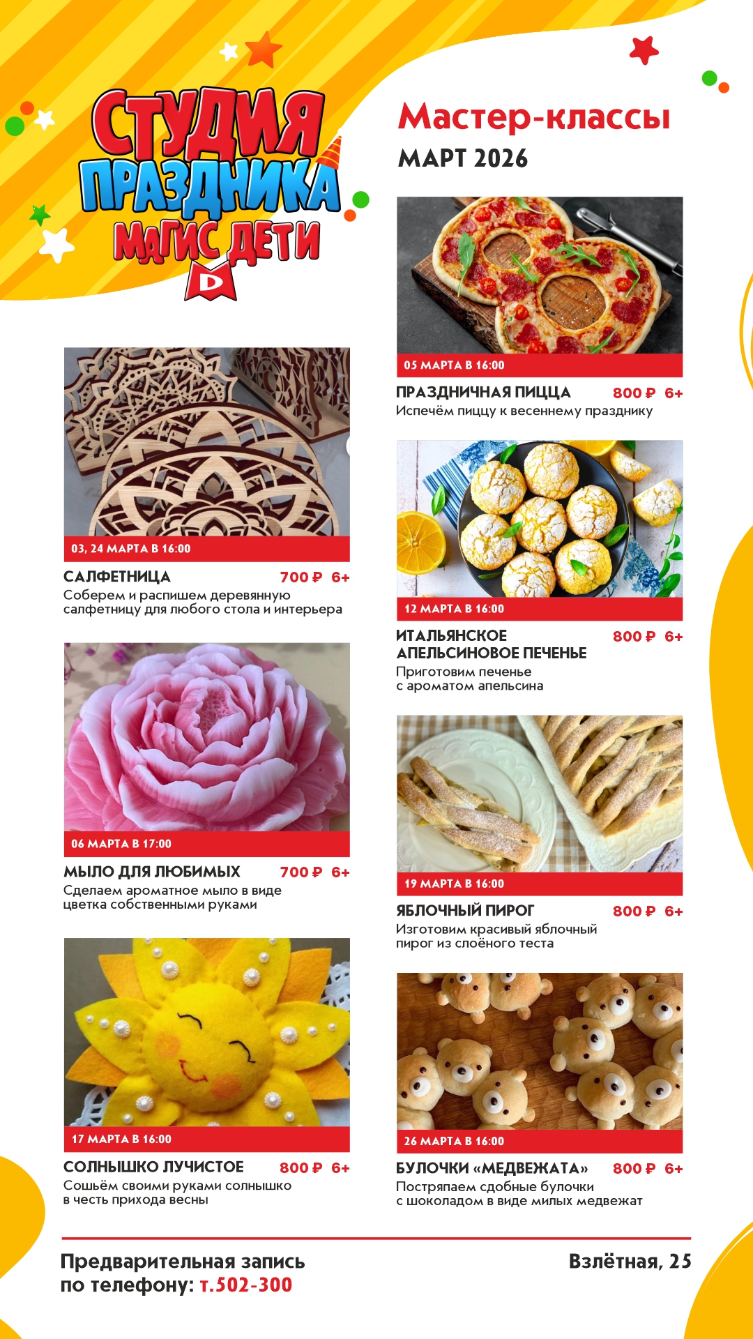 5 марта в 16:00 испечём праздничную пиццу 12 марта в 16:00 приготовим печенье с ароматом апельсина 19 марта в 16:00 изготовим красивый яблочный пирог из слоённого теста 26 марта в 16:00 постряпаем сдобные булочки с шоколадом в виде милых медвежат