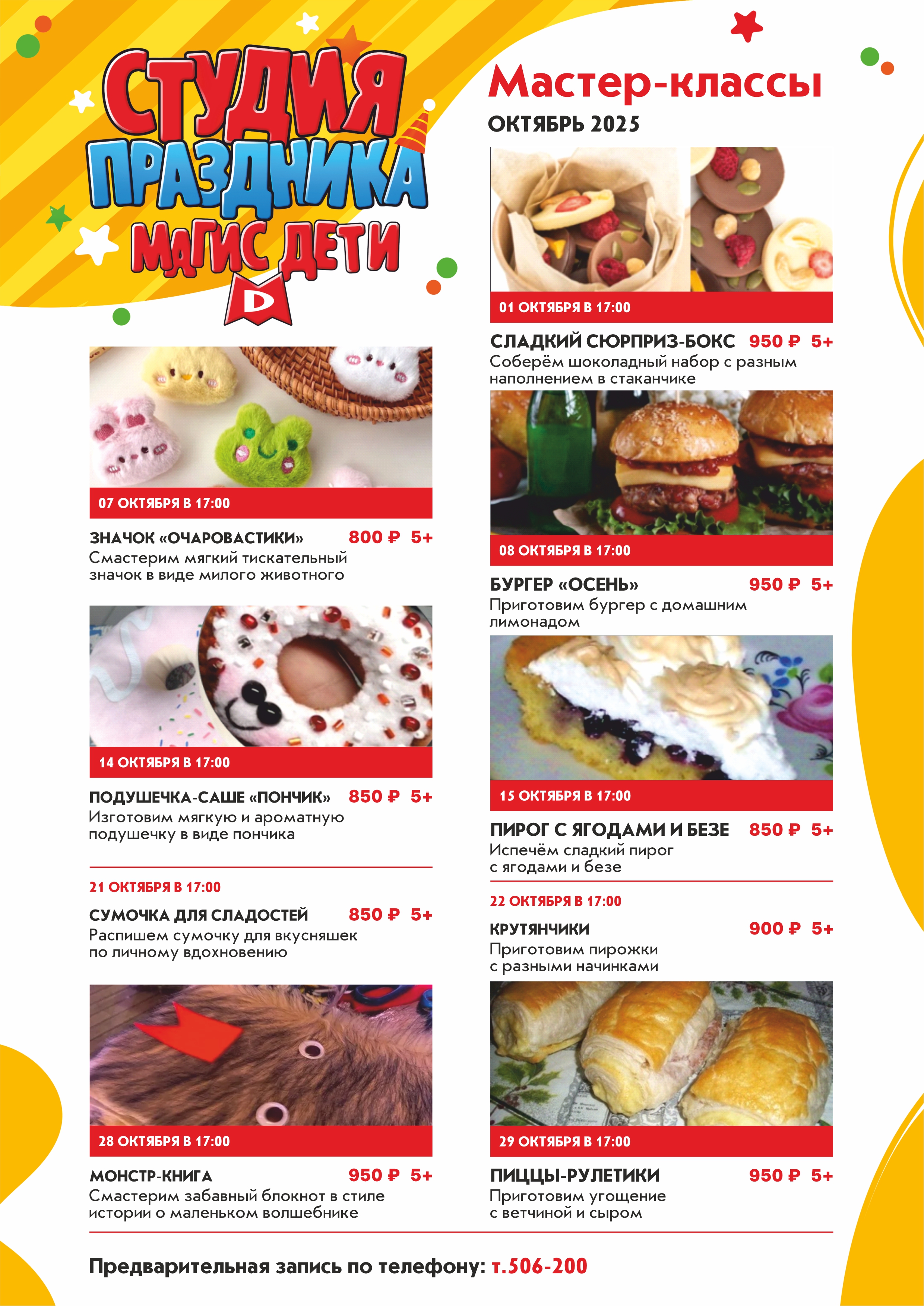 1 октября в 17:00 соберём шоколадный набор с разным наполнением в стаканчике 8 октября в 17:00 приготовим бургер с домашним лимонадом 15 октября в 17:00 испечём сладкий пирог с ягодами и безе 22 октября в 17:00 приготовим пирожки с разными начинками 29 октября в 17:00 приготовим пиццы-рулетики с ветчиной и сыром