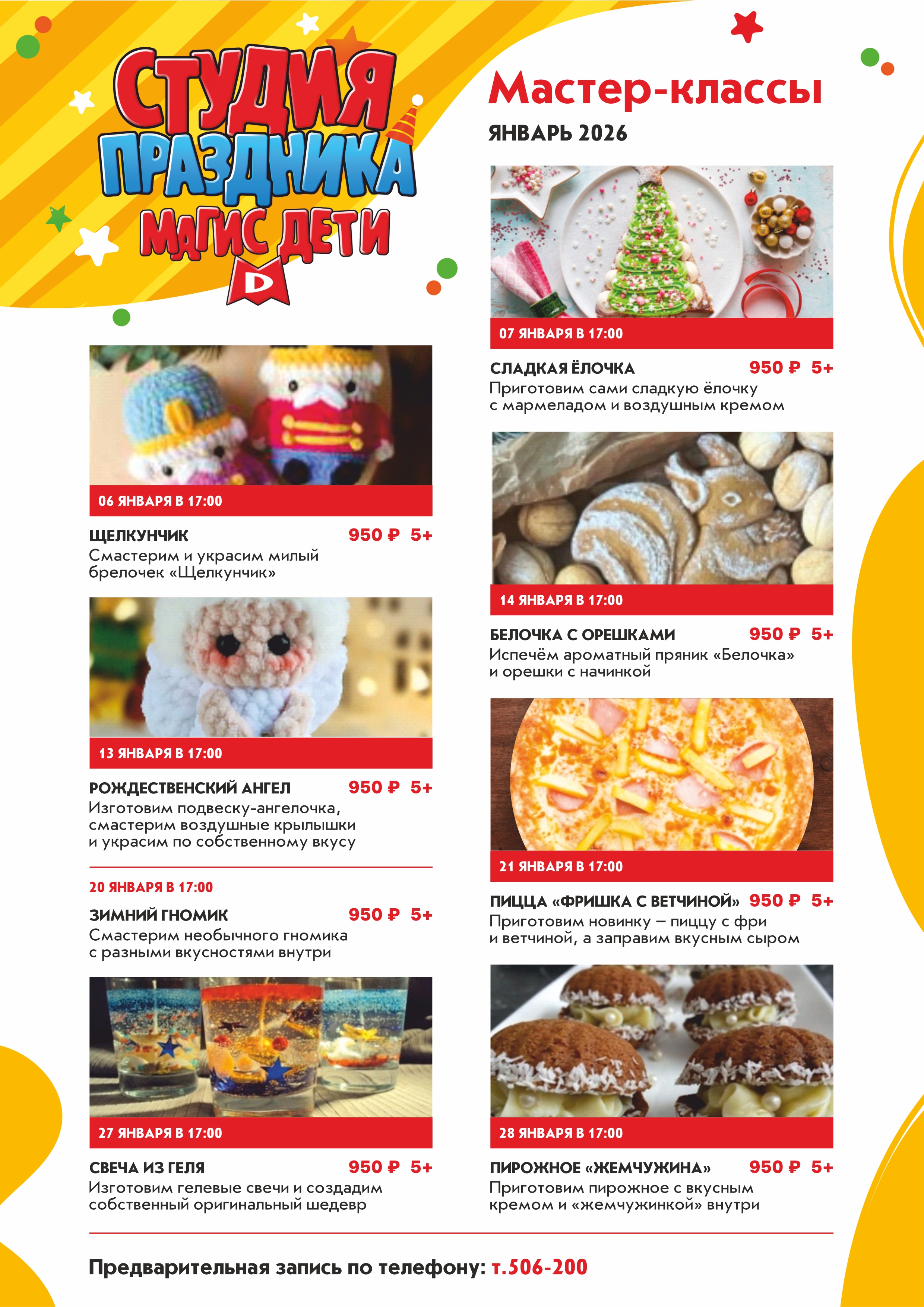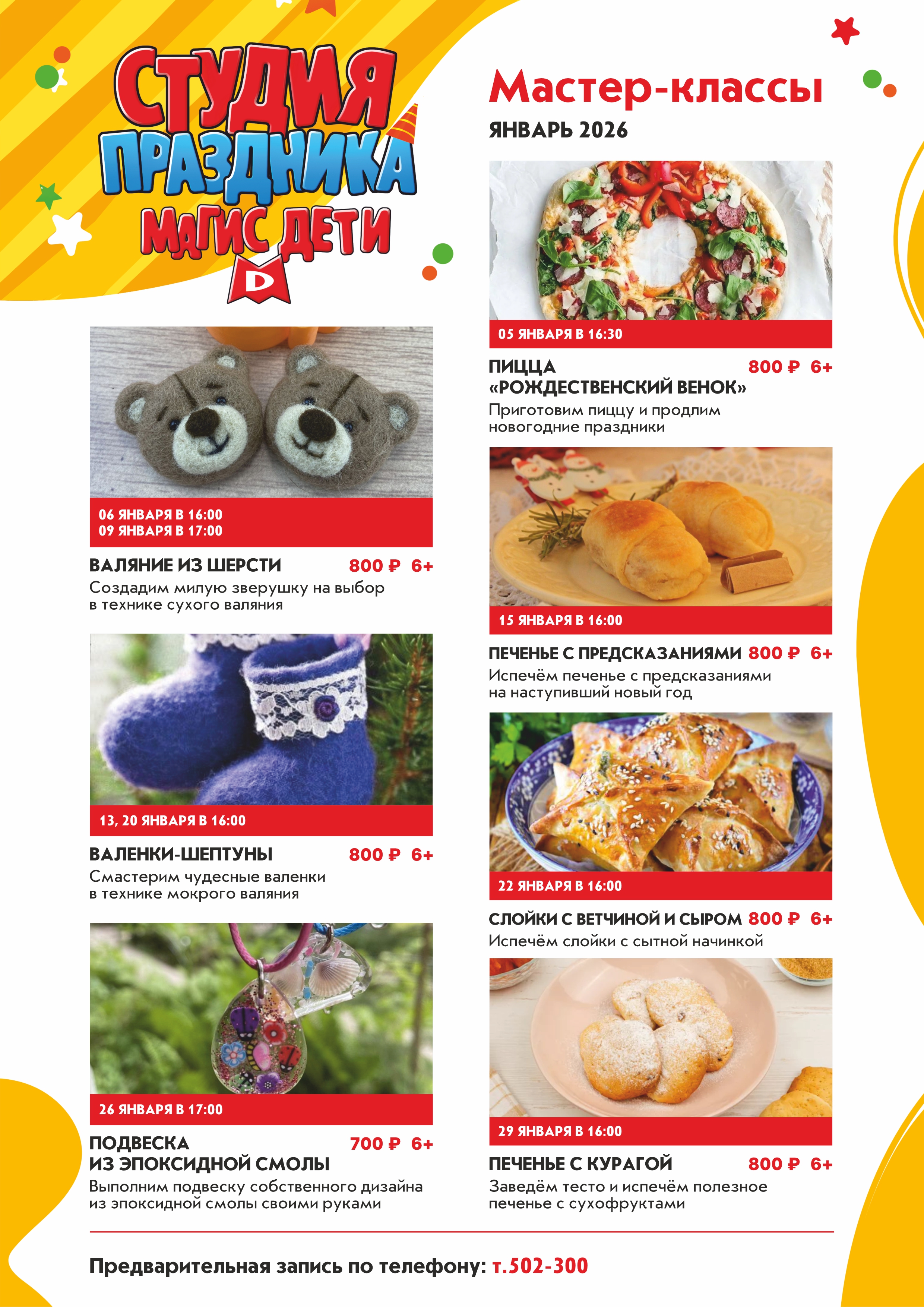 7 января в 17:00 приготовим сами сладкую ёлочку с мармеладом и воздушным кремом 14 января в 17:00 испечём ароматный пряник "Белочка" и орешки с начинкой 21 января в 17:00 приготовим новинку – пиццу с фри и ветчиной, а заправим сырным соусом 28 января в 17:00 приготовим пирожное с вкусным кремом и "жемчужинкой" внутри