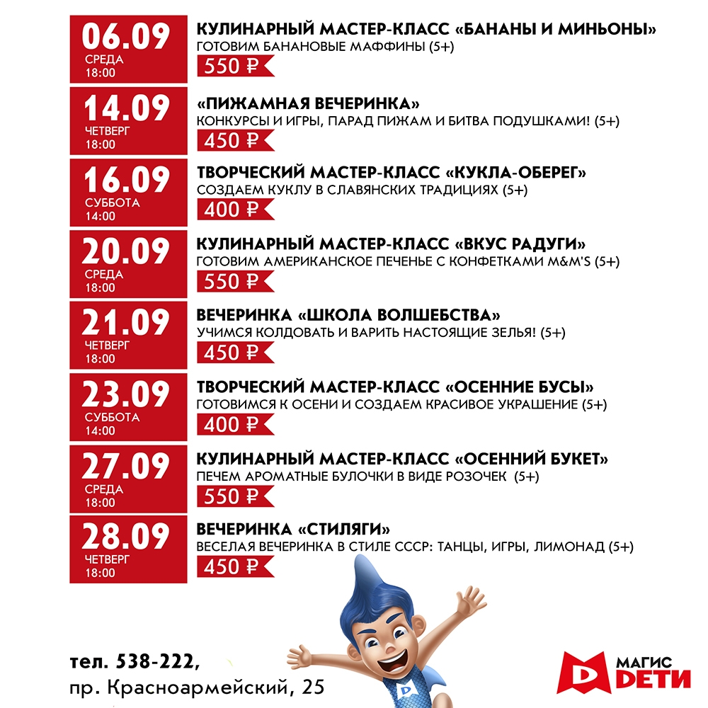 Сохраните расписание предстоящих мастер-классов и вечеринок, чтобы Ваш ребенок не пропустил ни одно из предстоящих захватывающих событий! В сентябре юных непосед и любознаек ждет обучение кулинарному мастерству, пижамная вечеринка, школа волшебства и путешествие в СССР на вечеринке стиляг. И это еще не все!