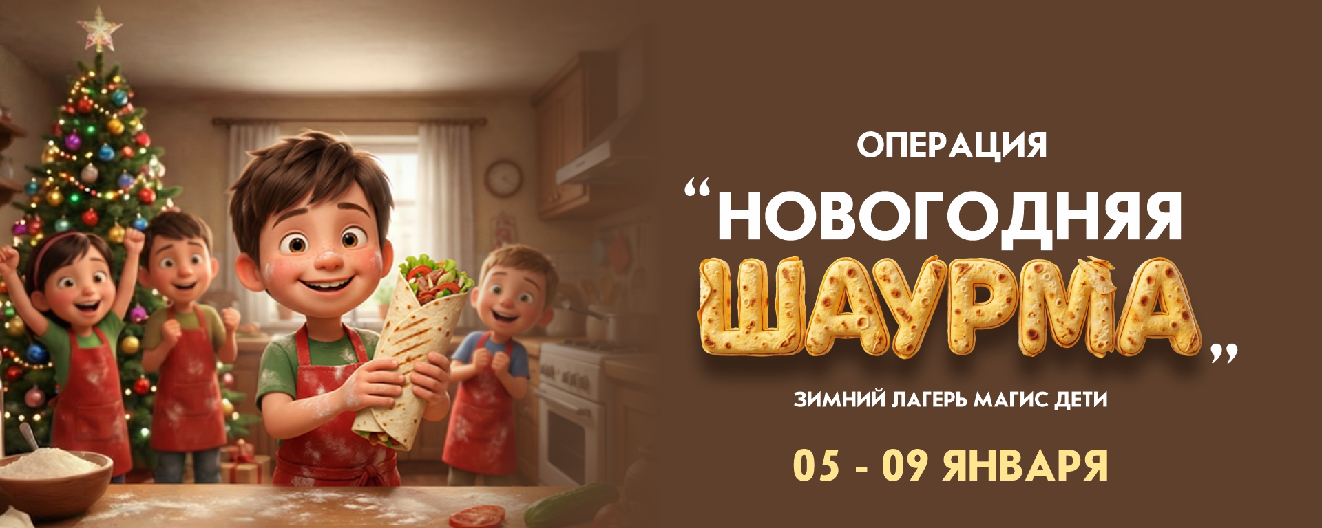 Приглашаем ваших юных героев в самый захватывающий Зимний Лагерь "Операция: Новогодняя Шаурма!" с 5 по 9 января! Это 5 дней, полных игр, творчества и незабываемых приключений!